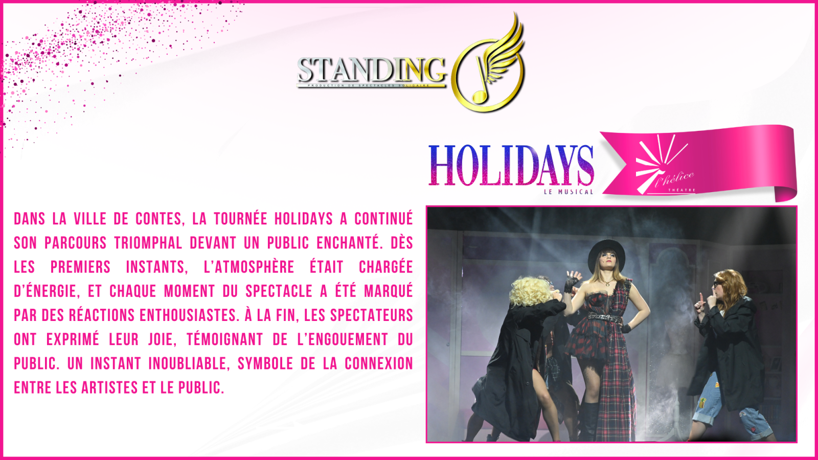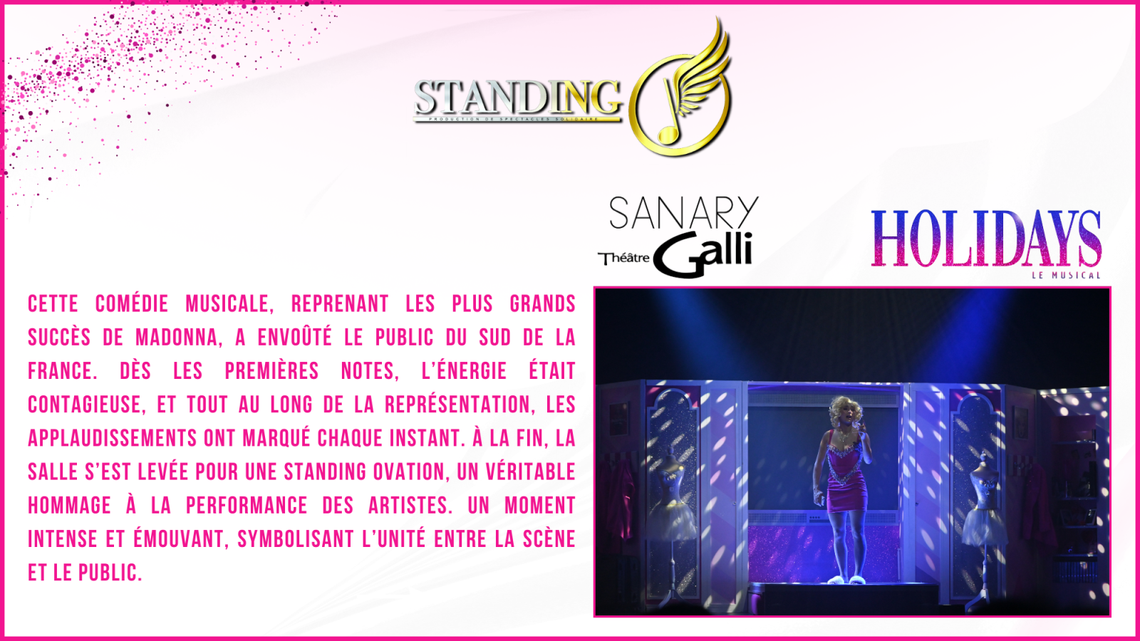 Les 27 et 28 février derniers, la tournée HOLIDAYS LE MUSICAL a fait vibrer le Sud de la France lors de deux dates exceptionnelles qui resteront gravées dans les mémoires. De Contes à Sanary-sur-Mer, les artistes ont conquis le public avec un spectacle aussi envoûtant qu’énergique, rendant hommage aux plus grands tubes de Madonna.