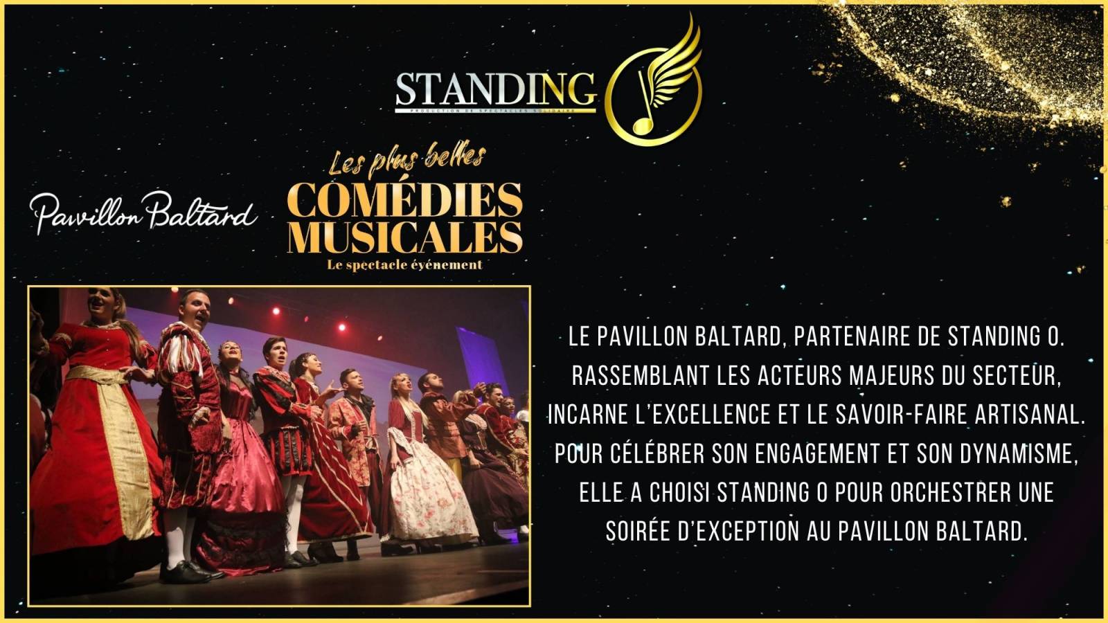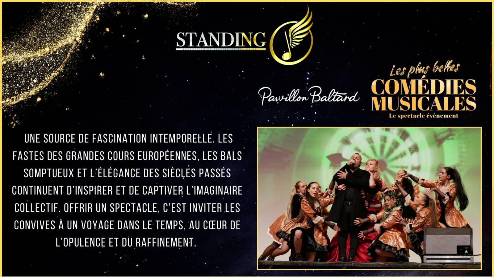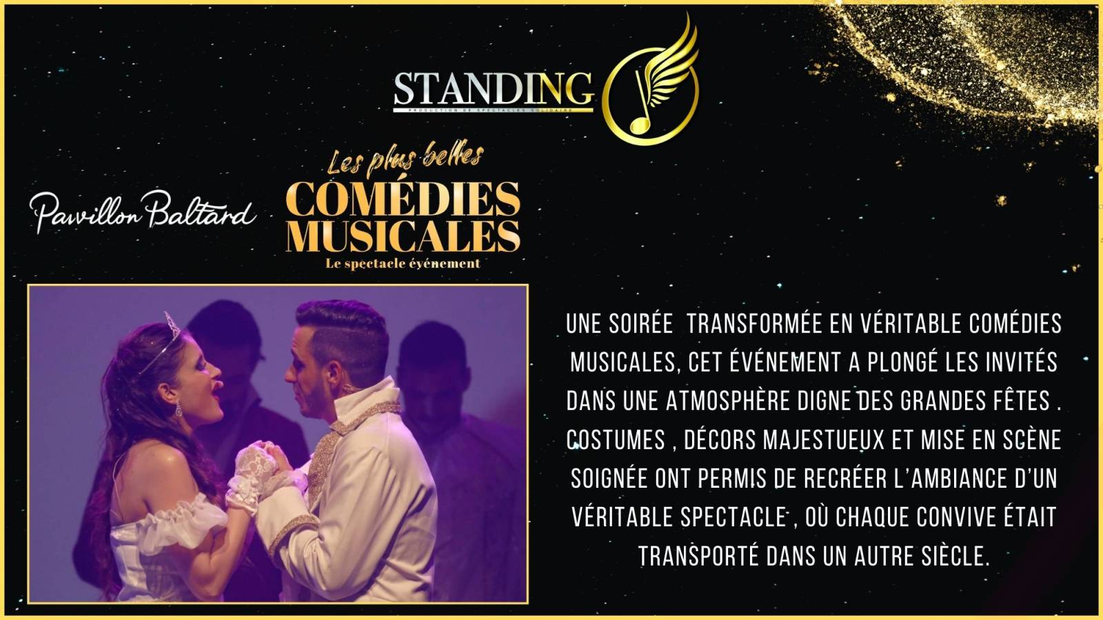 Le dimanche 12 janvier 2025, le Pavillon Baltard sera le théâtre du spectacle "Les Plus Belles Comédies Musicales", une production de l'équipe Standing O. Ce spectacle rend hommage aux œuvres emblématiques du répertoire musical francophone et anglophone. Les spectateurs auront l'occasion de redécouvrir des extraits de comédies musicales légendaires telles que Roméo & Juliette, Les Misérables, Le Roi Soleil, Notre-Dame de Paris, Grease, et bien d'autres.