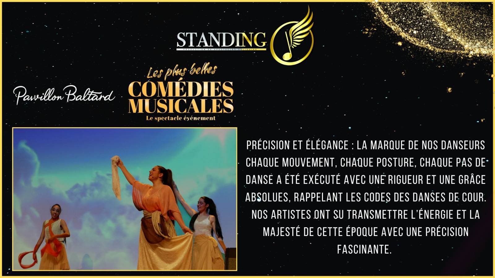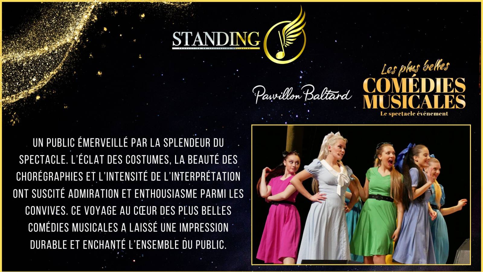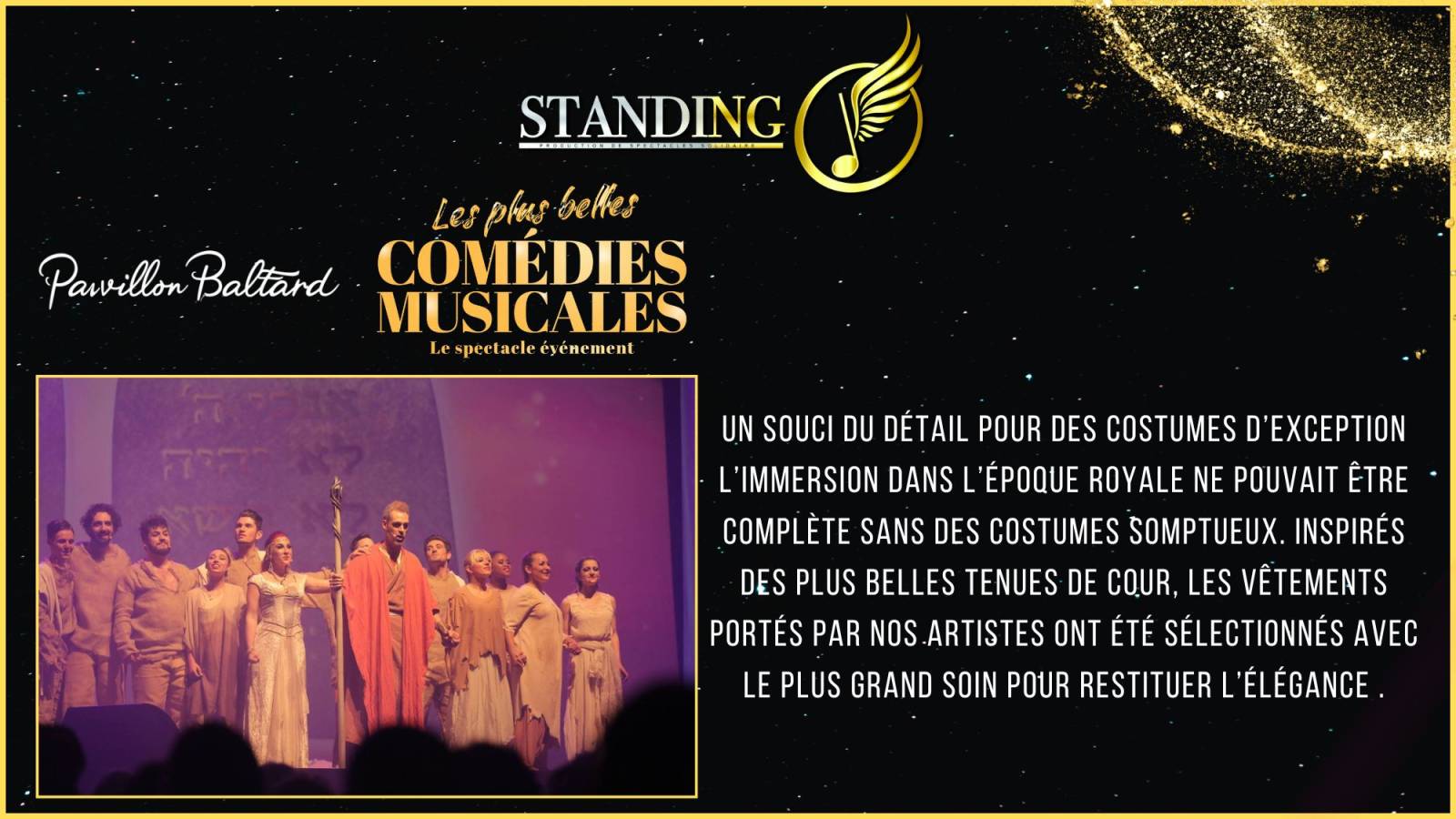 Le dimanche 12 janvier 2025, le Pavillon Baltard sera le théâtre du spectacle "Les Plus Belles Comédies Musicales", une production de l'équipe Standing O. Ce spectacle rend hommage aux œuvres emblématiques du répertoire musical francophone et anglophone. Les spectateurs auront l'occasion de redécouvrir des extraits de comédies musicales légendaires telles que Roméo & Juliette, Les Misérables, Le Roi Soleil, Notre-Dame de Paris, Grease, et bien d'autres.